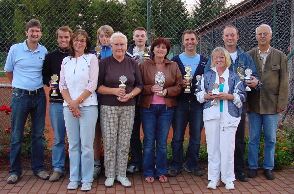 | Für die nächsten zwei Jahre in den Tennisausschuss gewählt wurden: hinten von links: Dieter Kausch (Sportwart), Siggi Salzbrenner (2. Jugendwart), Milos Mares (stellv. Abteilungsleiter), Alfred Huber (Kassier), Elli Greben (Vergügungswartin), Thorsten Stemmer (Jugendwart), Erwin Edler (Internetbeauftragter), BSV-Vorstand Klaus Eisenhofer , vorne von links: Ute Vogt (Schriftführerin), Sigrid Stemmer (Abteilungsleiterin), Claudia Salzbrenner (2. Vergnügungswartin), es fehlt Thomas Reiter (2.Sportwart), ein Pressewart/in wird noch gesucht. |