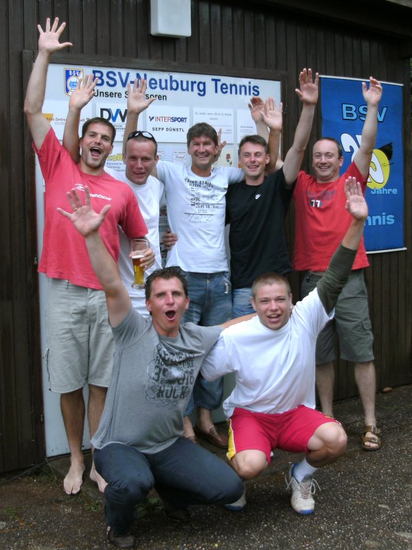 Herren 1 Meister in der Bezirksklasse 2 (gh) Die erste Herrenmannschaft der Tennisabteilung des BSV- Neuburg hat Großes vor. Nachdem die Vorzeigemannschaft in der vergangenen Saison ohne Punktverlust den Aufstieg in die Kreisklasse 1 schaffte, wiederholten sie dieses Meisterstück auch heuer in der Bezirksklasse 2. Minimalziel ist in der nächsten Saison ein dritter Aufstieg in Folge, um dann in der Bezirksliga mögliche Grenzen kennen zu lernen. Eine weitere Verstärkung der Mannschaft ist nicht geplant, obwohl schon namhafte Spieler der Region ihr Interesse an der Erfolgsmannschaft bekundeten.