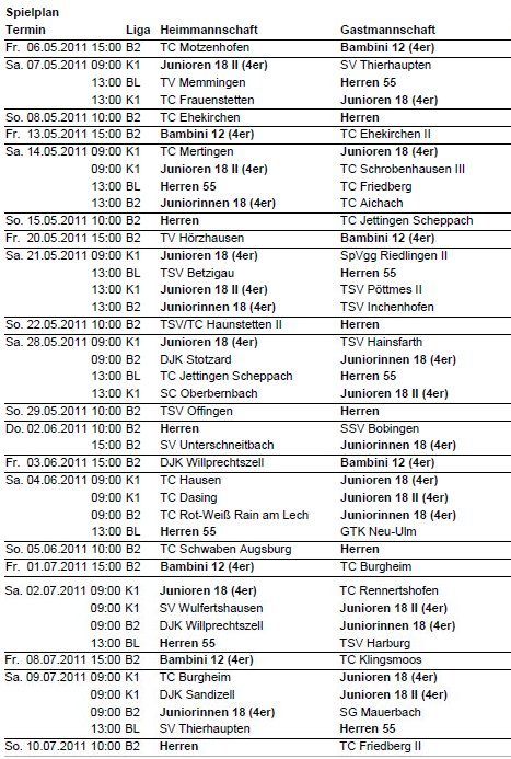 von links: Mirco Guderlei, Abteilungsleiter, Benedikt Pelz, Betreuer Gerhard Engel, Junioren ohne Probleme Tennis BSV-Jungen besiegen Hainsfarth Michael Mayer war für den BSV Neuburg wieder einmal der Punktelieferant. Der 21-Jährige holte vergangenen Sonntag gegen Offingen sowie am Donnerstag den einzigen Zähler für die Neuburger. breg Herren, Bezirksklasse 2: TSV Offingen BSV Neuburg 8:1: Mit 6:1 und 6:3 fegte Michael Mayer seinen Konkurrenten aus Offingen vom Platz wohingegen seine Mitspieler gegen die starken Schwaben erwartungsgemäß keine Chance hatten. Es spielten: Michael Regnet 0:6,/2:6, Mirco Guderlei 2:6/1:6, Michael Mayer 6:1/6:3, Thomas Selzer 5:7/4:6, Benedikt Pelz 1:6/2:6 und Markus Gabriel 0:6/0:6. Regnet/Guderlei 2:6/0:6, Mayer/Selzer 2:6/3:6 und Pelz/Gabriel 0:6/0:6. Herren, Bezirksklasse 2: BSV Neuburg SSV Bobingen 1:8: Nichts zu holen gab es auch am Donnerstag für die „Erste“. Die Youngsters Benedikt Pelz und Marcel Engel, der seinen ersten Einsatz im Seniorenbereich hatte, schlugen sich wacker, zu einem Spielgewinn reichte es jedoch nicht. Es spielten: Michael Regnet 0:6/1:6, Mirco Guderlei 4:6/1:6, Michael Mayer6:3/6:3, Gerhard Engel 4:6/3:6, Marcel Engel 0:6/0:6, Benedikt Pelz 0:6/0:6. Herren 55, Bezirksliga: TC Jettingen-Scheppach BSV Neuburg 8:1: Freddy Kohler steuerte den einzigen Punkt bei. Der Rest der Matches ging klar an die Gegner. Da schon in den Einzeln zwei Spiele verletzungsbedingt von den Neuburgern aufgegeben werden mussten, gingen die Doppel komplett an Jettingen. Die BSV’ler stehen durch diese Niederlage nun auf dem vorletzten Tabellenplatz. Es spielten: Erwin Edler, 0:6/1:6, Simon Konrad 4:6/0:6, Freddy Kohler 2:6/6:4/10:4, Manfred Korn (w.o.), Josef Seefried (w.o.), Peter Schmickler 4:6/3:6. Doppel (w.o.) Juniorinnen, Bezirksklasse 2: DJK Stotzard BSV Neuburg 4:2: Nach den Einzeln stand es 2:2. Mit hartem Kampf hatten Seherzada Puljarga und Julia Scheller im Match-Tiebreak das Ruder noch einmal herumgerissen, so dass zwei Doppel hätten gewonnen werden müssen. Durch eine unglückliche Aufstellung schafften aber genau das die Gegner. Es spielten: Seherzada Puljarga 6:4/6:7/12:10, Kathrin Neumeier 0:6/4:6, Eva Springer 0:6/0:6 und Julia Scheller 6:4/3:6/10:6. Puljarga/Neumeier 2:6/1:6/5:10 und Springer/Scheller 1:6/0:6. Junioren 1, Kreisklasse 1: BSV Neuburg TSV Hainsfarth 6:0: Weiter voll auf Erfolgskurs: Mit einem klaren Sieg führt die erste Juniorenmannschaft des BSV Neuburg die Tabelle an. Es spielten: Marcel Engel 6:3/6:3, Benedikt Pelz 6:4/6:2, Florian Abspacher 6:0/6:2, Tobias Rigler 6:3/4:6/12:10. Pelz/Abspacher 6:0/6:2 und Engel/Rigler 6:0/6:1. Junioren 2, Kreisklasse 1: SC Oberbernbach BSV Neuburg 5:1: Die Nerven bewahrte Magnus Singer beim Auswärtsspiel gegen den SC Oberbernbach. Im Match-Tiebreak besiegte er seinen Gegner knapp mit 11:9 und holte damit den einzigen Punkt für die Neuburger. Es spielten: Sebastian Springer 2:6/2:6, Magnus Singer 6:4/3:6/11:9, Dominik Paukert 2:6/2:6 und Stefan Hein 0:6/0:6. Springer/Hein 1:6/4:6, Singer/Paukert 3:6/7:5. Herren schlagen sich wacker Junges Team verliert trotzdem deutlich in Haunstetten Melanie Hafner Drei Heimspiele trugen die Tennis-Teams des BSV Neuburg am vergangenen Wochenende aus, punkten konnte jedoch nur die erste Juniorenmannschaft. Dazu setzte es noch zwei Auswärtsniederlagen. Herren, Bezirksklasse 2: TSV/TC Haunstetten II BSV Neuburg 8:1: Mit einer sehr jungen Mannschaft traten die Herren in Haunstetten an und schlugen sich wacker. Allerdings lagen sie erneut nach den Einzeln bereits 0:6 zurück. Zumindest Michael Regnet an Nummer eins und Michael Mayer an Nummer drei gelang es, ihre Gegner im ersten Satz etwas unter Druck zu setzen. Als Ersatzspieler durften Benedikt Pelz und Marcel Engel erste Erfahrungen im Herrentennis sammeln. Einen Ehrenpunkt holten Regnet/Guderlei im ersten Doppel. Ergebnisse: Regnet (4:6, 2:6), Guderlei (2:6, 2:6), Mayer (5:7, 2:6), Engel G. (1:6, 0:6), Pelz (0:6, 1:6), Gabriel (0:6, 0:6). Regnet/Guderlei (6:3, 6:4), Mayer/Pelz (0:6, 0:6), Engel G./Engel M. (0:6, 0:6). Herren 55, Bezirksliga: TSV Betzigau BSV Neuburg 8:1: Diese Woche kam es in Betzigau zu einer deutlichen Niederlage der Herren 55. Lediglich Simon und Stempfle schafften es in den Einzeln in den Match-Tiebreak, verloren diesen dann aber knapp. In den Doppeln bewiesen Kumpfe/Simon Nervenstärke und sicherten so einen Ehrenpunkt. Ergebnisse: Kumpfe (3:6, 1:6), Simon (6:7, 6:2, 8:10), Seefried (1:6, 2:6), Schmickler (4:6, 3:6), Stempfle (0:6, 6:4, 7:10), Kappl (2:6, 3:6). Kumpfe/Simon (4:6, 6:3, 10:8), Seefried/Kappl (1:6, 3:6), Schmickler/Stempfle (6:7, 7:6, 6:10). Junioren 1, Kreisklasse 1: BSV Neuburg SpVgg Riedlingen 5:1: Wie meistens waren Marcel Engel und Benedikt Pelz im Einzel und Doppel souverän. Zudem überraschte Tobias Rigler mit einem knappen Sieg im Match-Tiebreak und einem gut erkämpften Erfolg im Doppel mit Florian Abspacher. Ergebnisse: Engel (6:1, 6:0), Pelz (6:1, 6:1), Abspacher (6:1, 4:6, 5:10), Rigler (2:6, 6:3, 10:8). Engel/Pelz (6:0, 6:0), Abspacher/Rigler (6:4, 1:6, 10:6). Junioren 2, Kreisklasse 1: BSV Neuburg 2 TSV Pöttmes 2 2:4: Bei der zweiten Juniorenmannschaft konnten lediglich zwei Punkte ergattert werden. Dabei profitierte das Geburtstagskind Dominik Paukert von der Aufgabe seines Gegners im Einzel und im Doppel. Ergebnisse: Springer (2:6, 2:6), Singer (1:6, 1:6), Paukert (6:0, 6:0), Hein (3:6, 2:6). Springer/Singer (5:7, 2:6), Paukert/Hein (6:0, 6:0). Juniorinnen, Bezirksklasse 2: BSV Neuburg TSV Inchenhofen 2:4: Die jungen Damen des BSV Neuburg kämpften eisern, kamen aber über ein 2:4 nicht hinaus. Einzig Seherzada Puljarga fuhr im Einzel und im Doppel mit Eva Springer die Punkte ein. Ergebnisse: Puljarga (6:0, 6:0), Torski (0:6, 3:6), Neumeier (1:6, 0:6), Scheller (1:6, 2:6). Puljarga/Springer (6:1, 7:6), Torski/Scheller (2:6, 1:6). BSV-Herren sind ohne Chancen Klare Niederlage gegen Ehekirchen im ersten Spiel Mit einer durchwachsenen Bilan